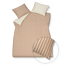 De achterkant van het dekbedovertrek is effen naturel. De kussens hebben aan de ene kant strepen en aan de andere kan zijn ze effen naturel.